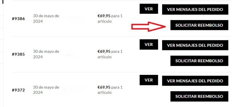 Cuando ya estes dentro de tus pedidos . Haz Click en «Solicitar reembolso» en el pedido que desees.