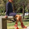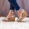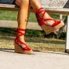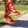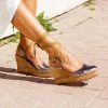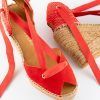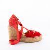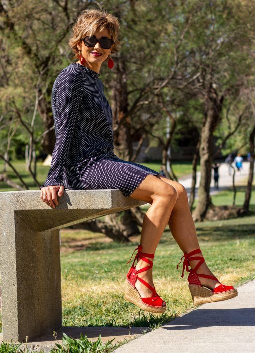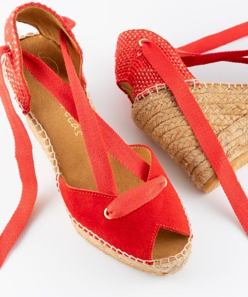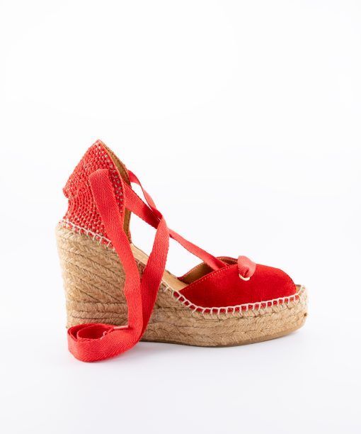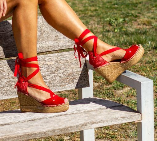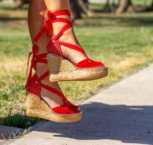 Alpargata con cuña elaborada en serraje. Talonera de tejido trenzado, y forrado para mayor resistencia y mayor comodidad ya que evita las arrugas en el talón. Cierre con cintas desde el empeine para atar al tobillo. Suela vulcanizada de yute teñido y caucho, forrada con piel y plantilla de látex, ofreciendo mayor confort al caminar. Altura de 10 cm, cuña de 7 cm y plataforma de 3 cm. Hechas totalmente a mano en España.