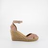 Alpargata con cuña elaborada en serraje. Talonera de tejido trenzado, y forrado para mayor resistencia y mayor comodidad ya que evita las arrugas en el talón. Cierre con cintas desde el empeine para atar al tobillo. Suela vulcanizada de yute teñido y caucho, forrada con piel y plantilla de látex, ofreciendo mayor confort al caminar. Altura de 9 cm, cuña de 7 cm y plataforma de 2 cm. Hechas totalmente a mano en España.