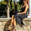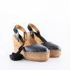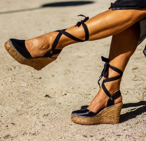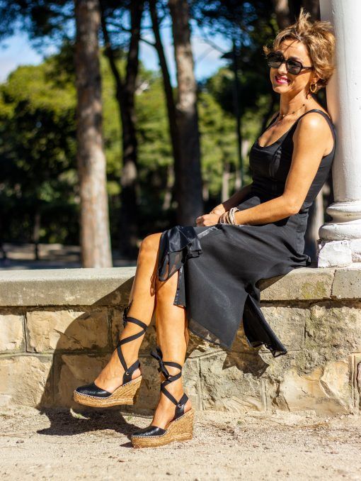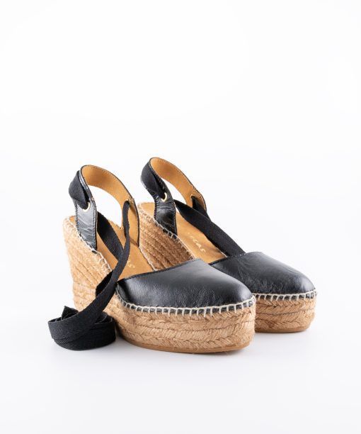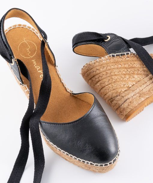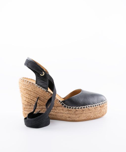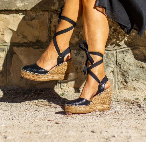 Alpargata con cuña elaborada en vacuno. Suela vulcanizada de yute teñido y caucho, forrada con microfibra y plantilla de látex, ofreciendo mayor confort al caminar. Altura de 10 cm, cuña de 7 cm y plataforma de 3 cm. Hechas totalmente a mano en España.