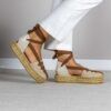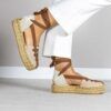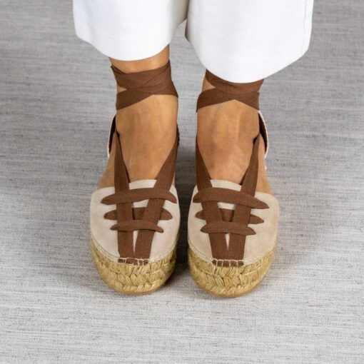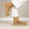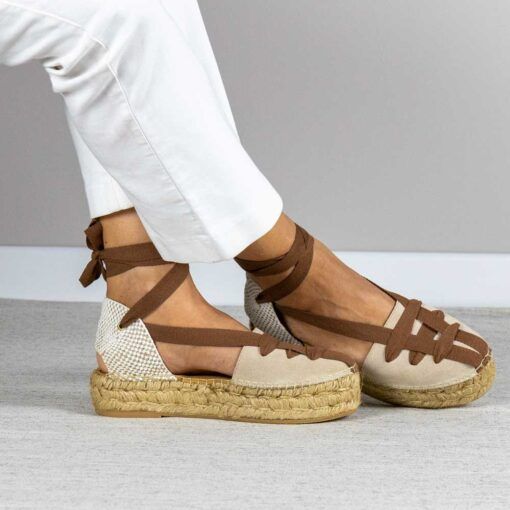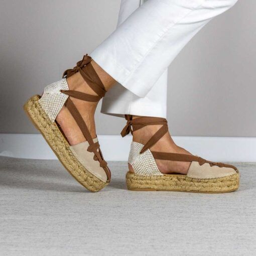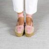 Alpargata con plataforma elaborada en serraje. Talón mecánico . Suela vulcanizada de yute teñido y caucho, forrada con microfibra y plantilla de látex, ofreciendo mayor confort al caminar. Plataforma de 3.5 cm. Hechas totalmente a mano en España.