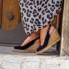 Alpargata con cuña elaborada en serraje. Suela vulcanizada de yute teñido y caucho, forrada con microfibra y plantilla de látex, ofreciendo mayor confort al caminar. Altura de 9 cm, cuña de 7 cm y plataforma de 2 cm. Hechas totalmente a mano en España.