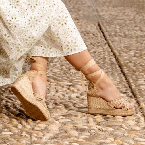 Alpargata con cuña elaborada tejido.Talonera de tejido trenzado, y forrado para mayor resistencia y mayor comodidad ya que evita las arrugas en el talón. Cierre con cintas para atar al tobillo. Suela vulcanizada de yute teñido y caucho, forrada con piel y plantilla de látex, ofreciendo mayor confort al caminar. Altura de 10 cm, cuña de 7 cm y plataforma de 3 cm. Hechas totalmente a mano en España.