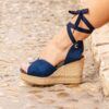 Alpargata con cuña elaborada en napa. Talonera de tejido trenzado, y forrado para mayor resistencia y mayor comodidad ya que evita las arrugas en el talón. Cierre con cintas desde el empeine para atar al tobillo. Suela vulcanizada de yute teñido y caucho, forrada con piel y plantilla de látex, ofreciendo mayor confort al caminar. Altura de 10 cm, cuña de 7 cm y plataforma de 3 cm. Hechas totalmente a mano en España.