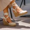 Alpargata con cuña elaborada en napa. Talonera de tejido trenzado, y forrado para mayor resistencia y mayor comodidad ya que evita las arrugas en el talón. Cierre con cintas desde el empeine para atar al tobillo. Suela vulcanizada de yute teñido y caucho, forrada con piel y plantilla de látex, ofreciendo mayor confort al caminar. Altura de 10 cm, cuña de 7 cm y plataforma de 3 cm. Hechas totalmente a mano en España.