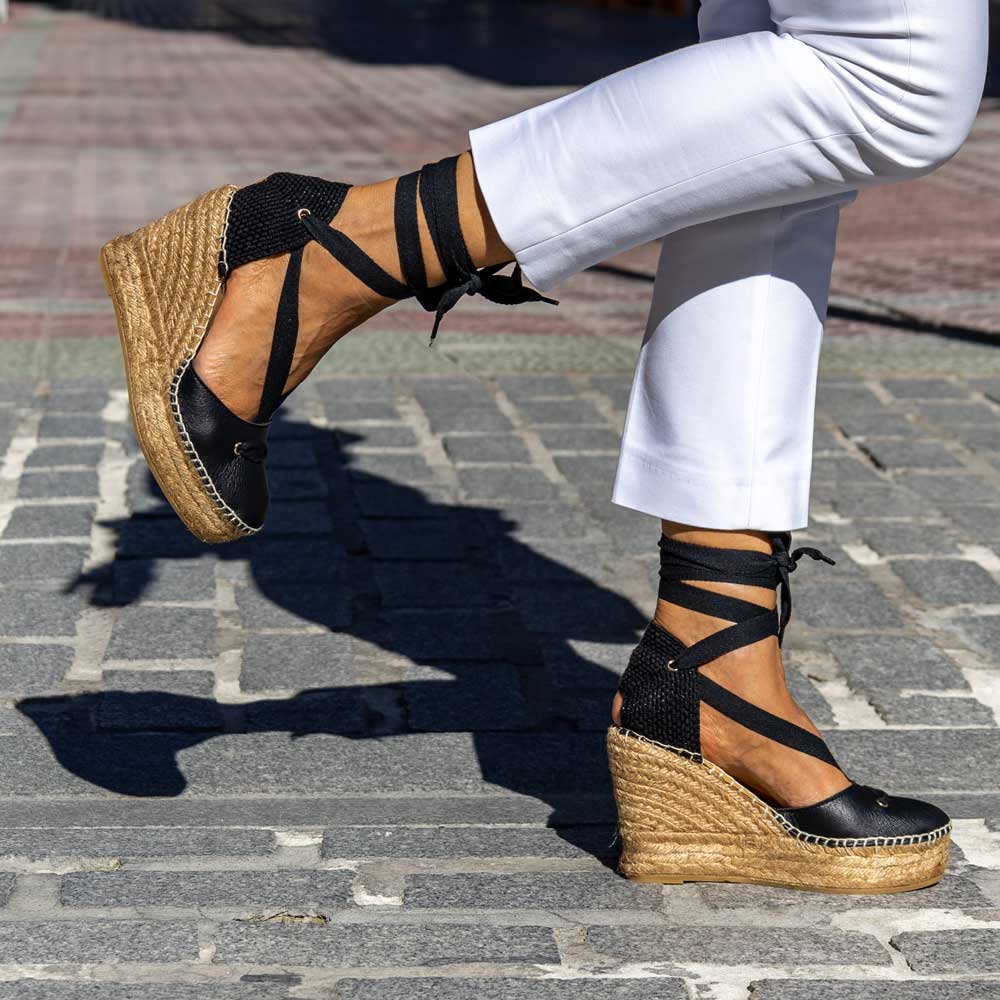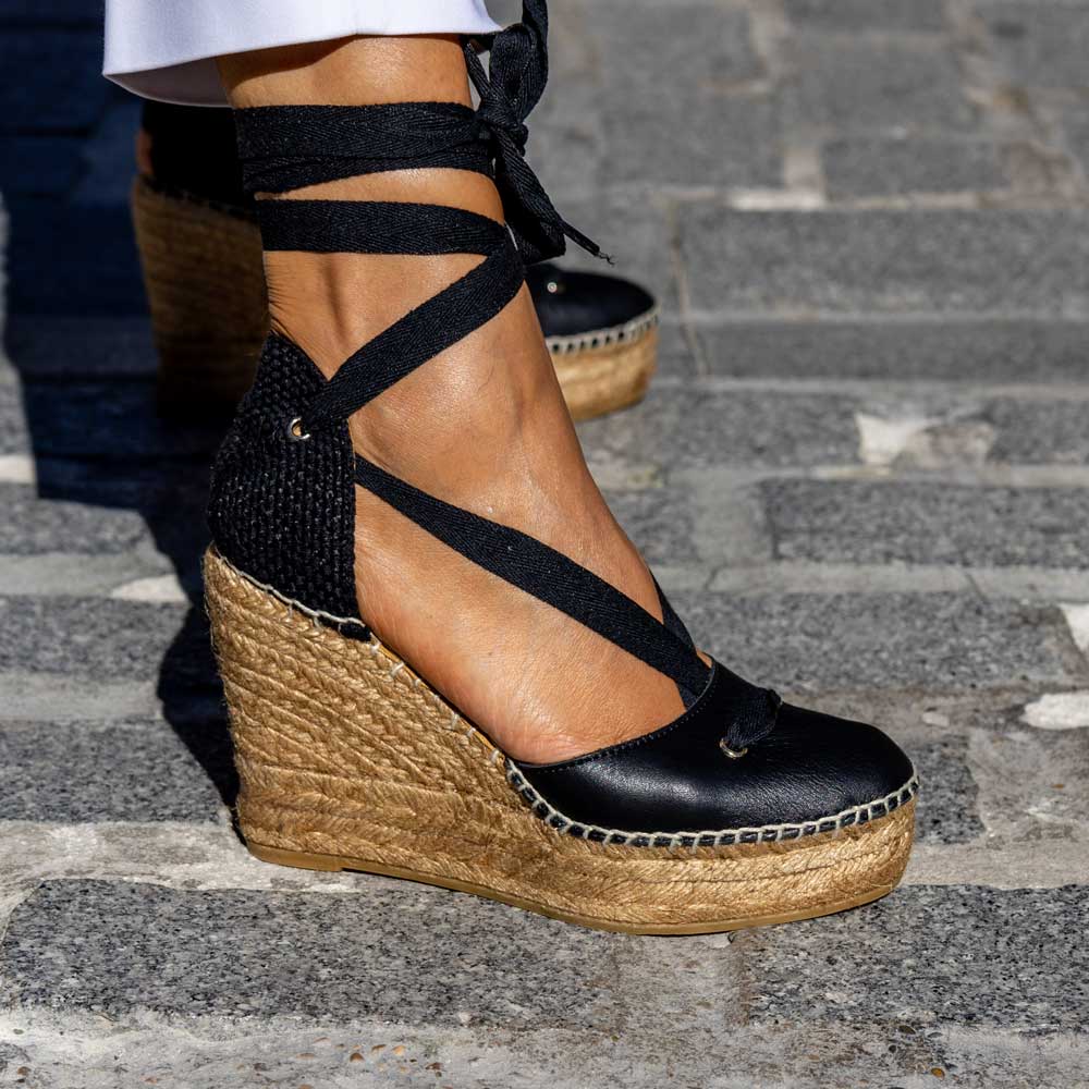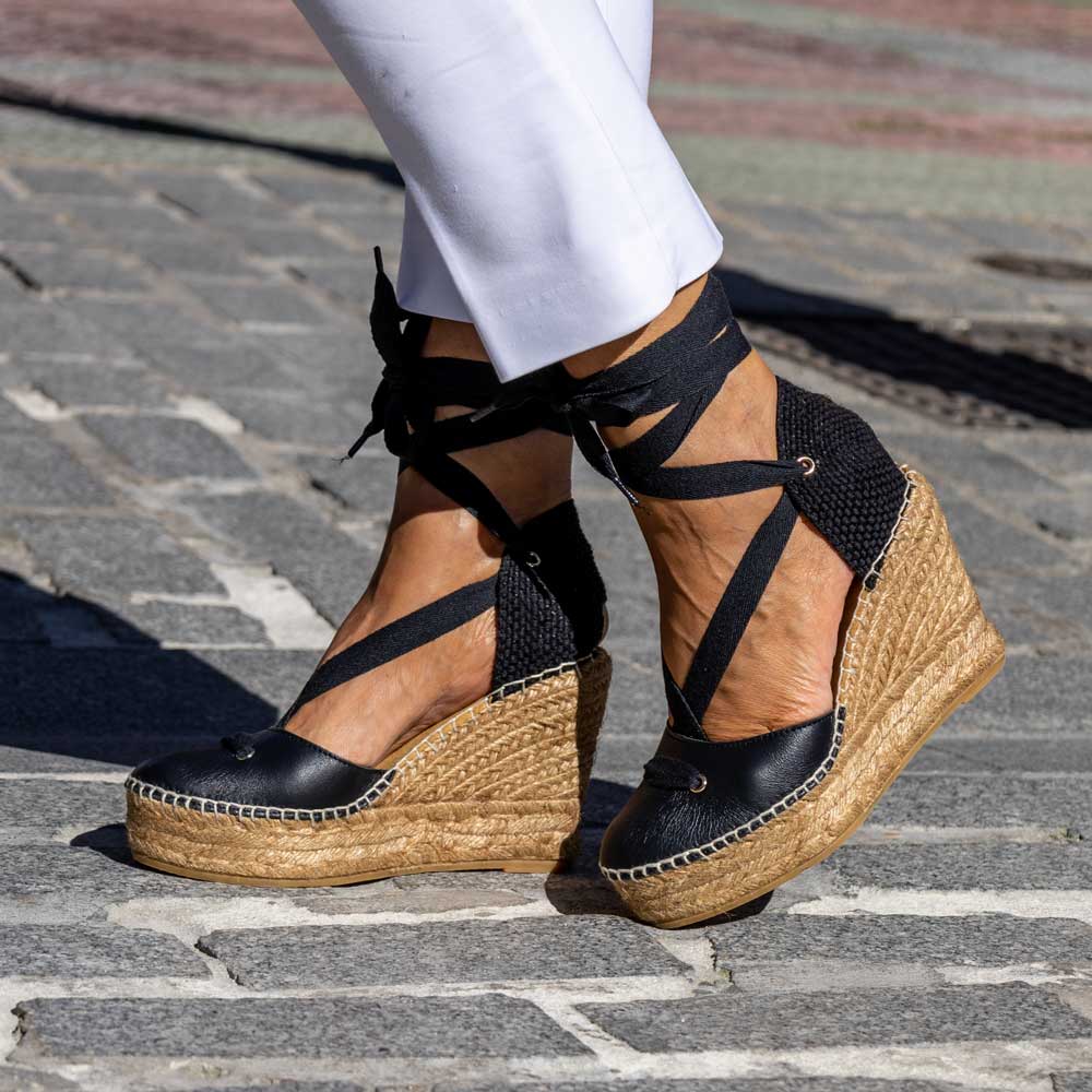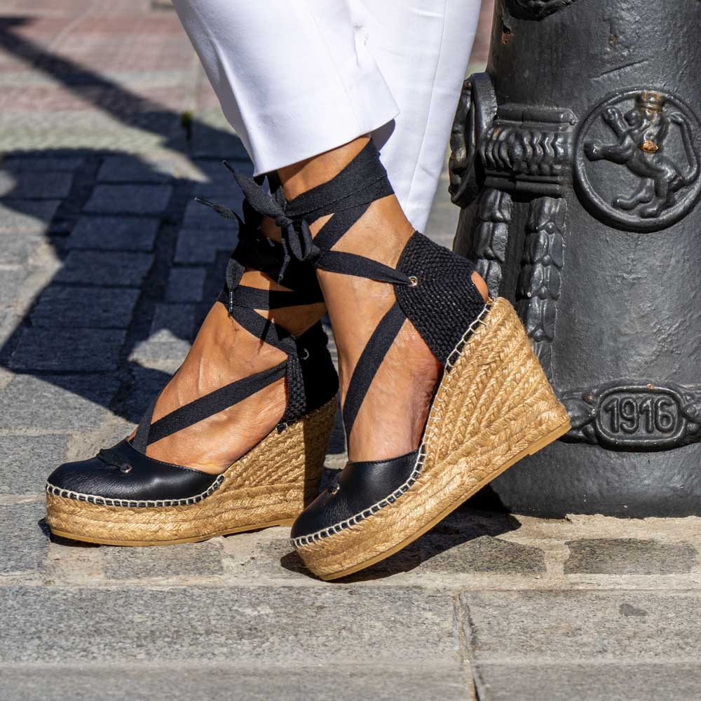 Alpargata con cuña elaborada en napa. Talonera de tejido trenzado, y forrado para mayor resistencia y mayor comodidad ya que evita las arrugas en el talón. Cierre con cintas desde el empeine para atar al tobillo. Suela vulcanizada de yute teñido y caucho, forrada con piel y plantilla de látex, ofreciendo mayor confort al caminar. Altura de 10 cm, cuña de 7 cm y plataforma de 3 cm. Hechas totalmente a mano en España.