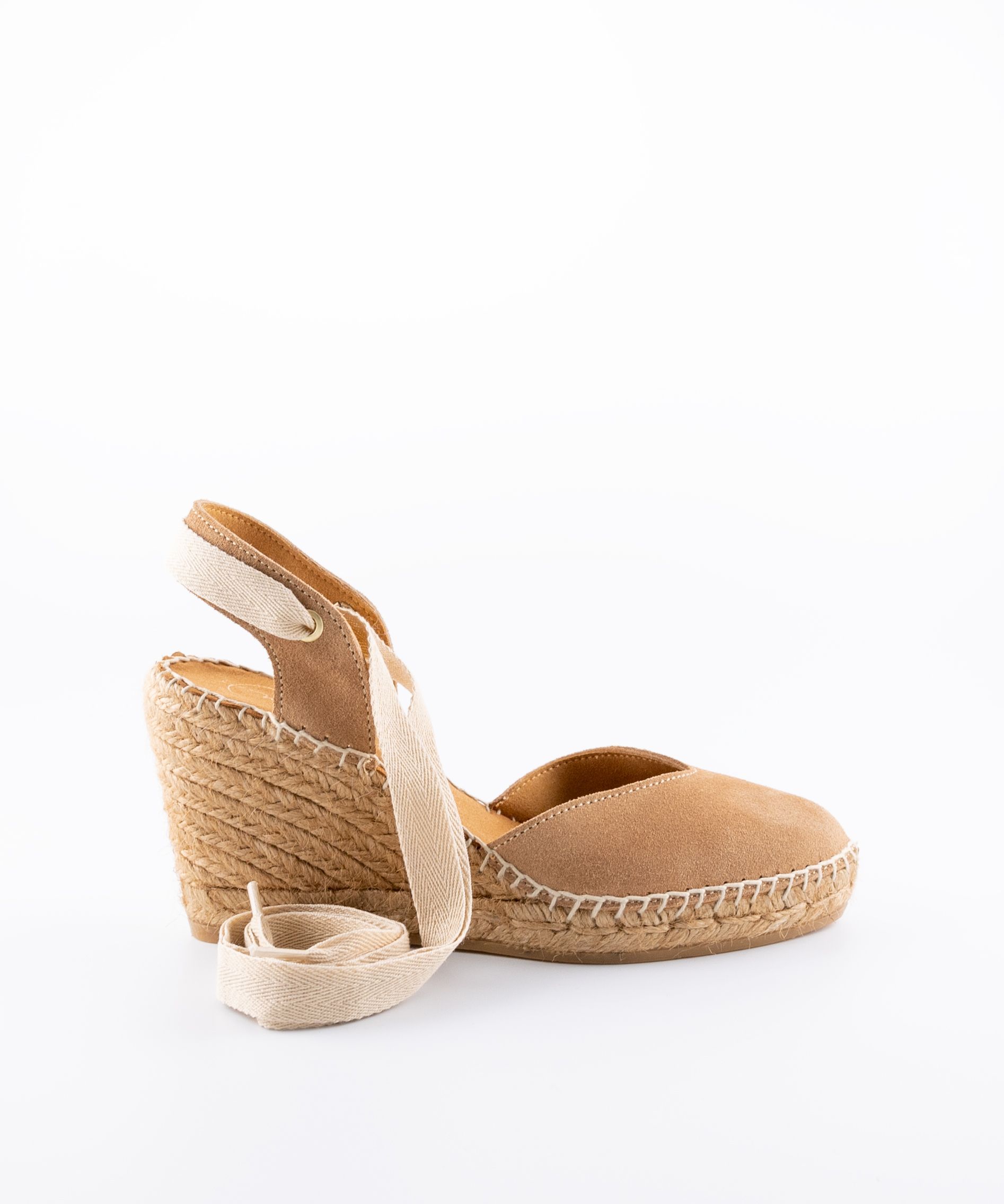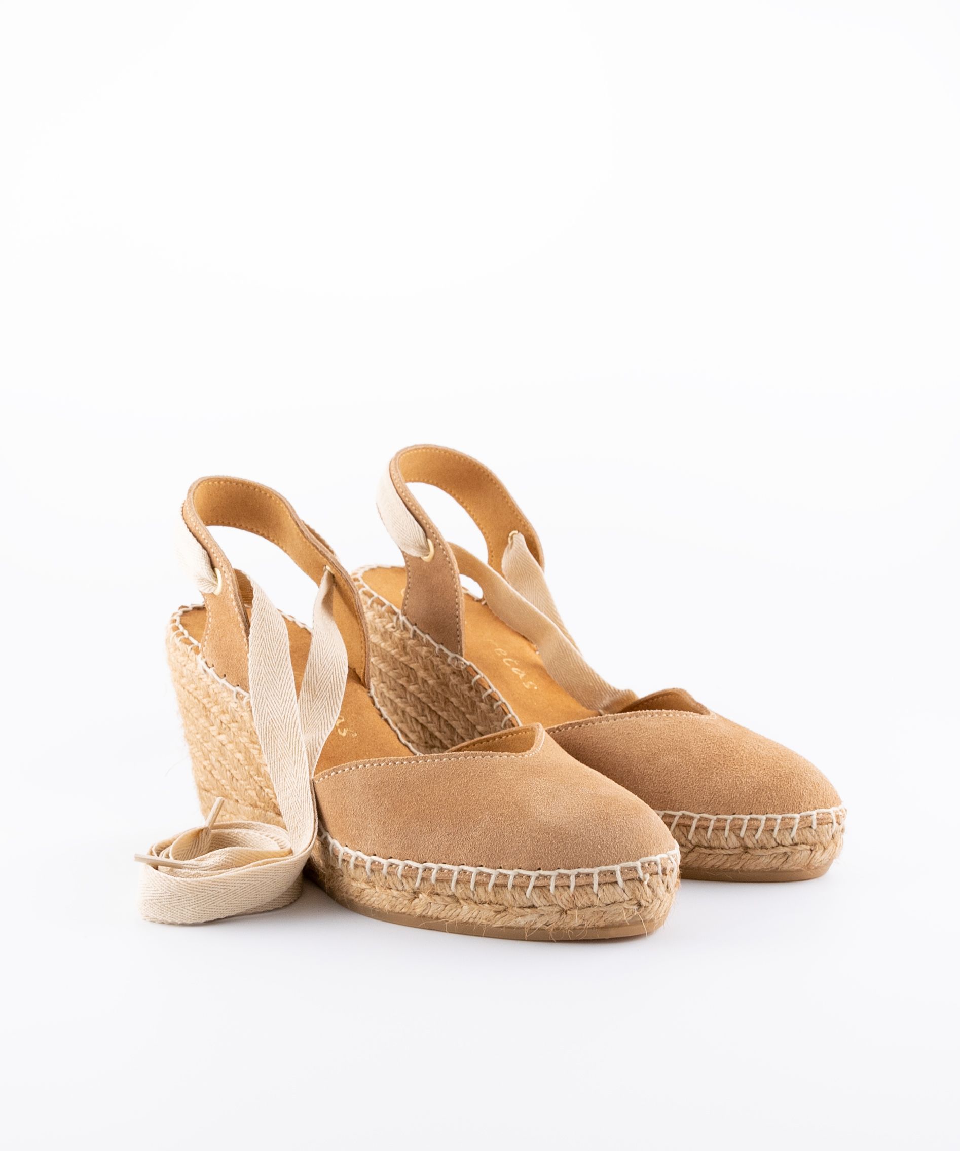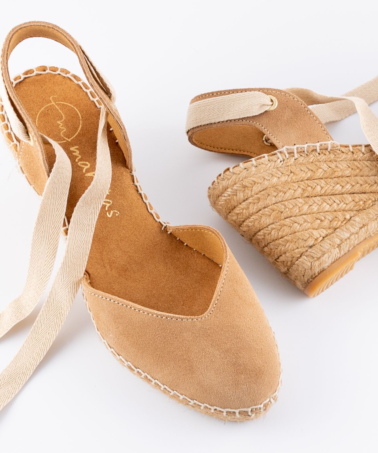 Alpargata con cuña elaborada en serraje. Cierre con cintas . Suela vulcanizada de yute teñido y caucho, forrada con microfibra y plantilla de látex, ofreciendo mayor confort al caminar. Altura de 9 cm, cuña de 7 cm y plataforma de 2 cm. Hechas totalmente a mano en España.