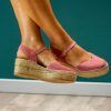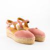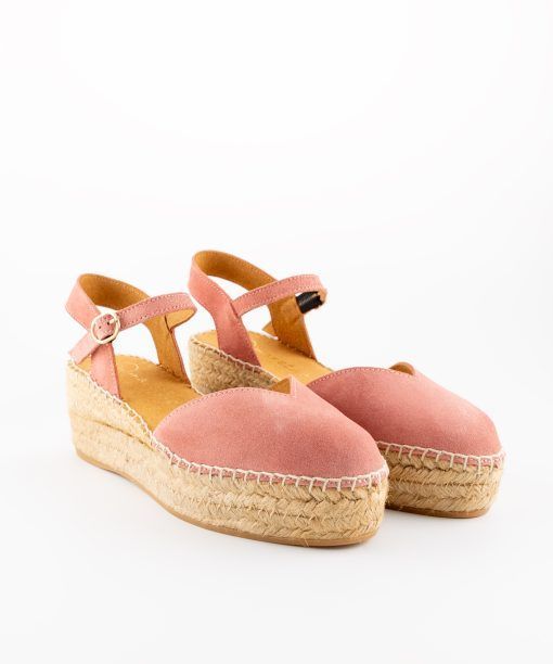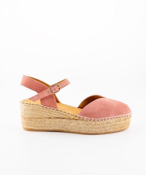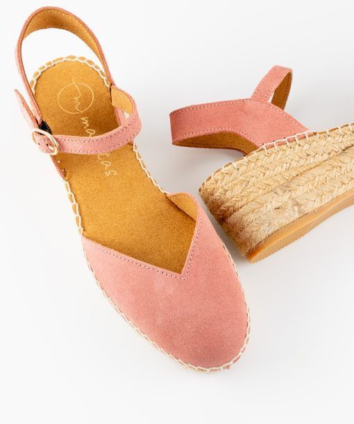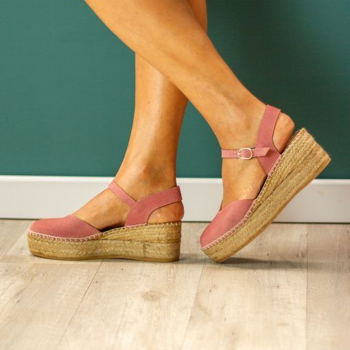 Alpargata con cuña elaborada en serraje. Talonera de piel . Suela vulcanizada de yute teñido y caucho, forrada con microfibra y plantilla de látex, ofreciendo mayor confort al caminar. Altura de 6 cm, cuña de 3 cm y plataforma de 3 cm. Hechas totalmente a mano en España.