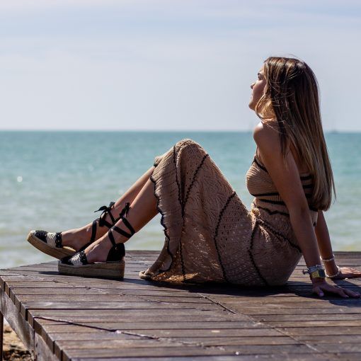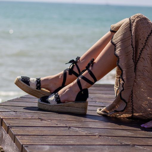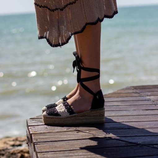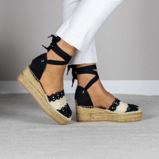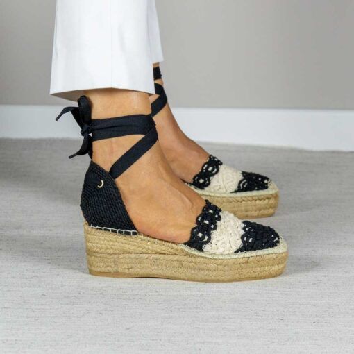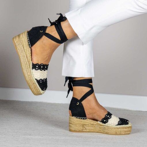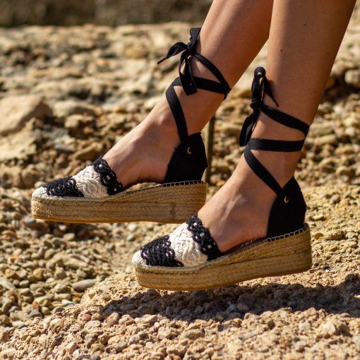 Alpargata con cuña elaborada en ganchillo. Talonera mecanizada forrada . Suela vulcanizada de yute teñido y caucho, forrada con microfibra y plantilla de látex, ofreciendo mayor confort al caminar. Altura de 6 cm, cuña de 3 cm y plataforma de 3 cm. Hechas totalmente a mano en España.