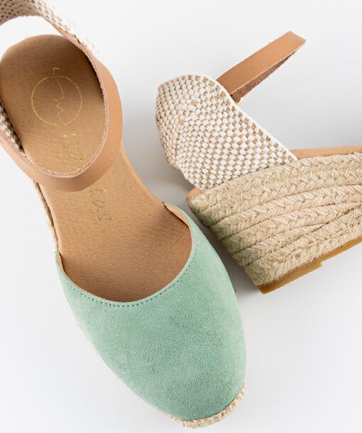 Alpargata con cuña elaborada en serraje . Suela vulcanizada de yute teñido y caucho, forrada con microfibra y plantilla conford, ofreciendo mayor comodidad al caminar. Altura de 7 cm, cuña de 5 cm y plataforma de 2 cm. Hechas totalmente a mano en España.